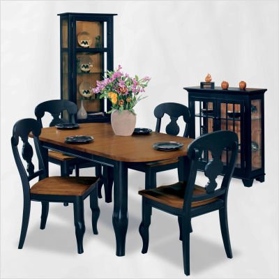 60257/60757 Features: -Set includes dining table and chairs. -ColorTime collection. -Table top and chair seat finish: Chestnut. -Table base and chair frame finish: Pirate black. -Dining table and chair construction: Solid birch and birch veneers construction. -Table and chair features catalyzed lacquer table top, hand rubbed and distressed. -Chair features carved out saddle seat and nylon glides on leg bottoms. -Traditional style. -Optional cabinet and console construction: Solid northern hardwood construction. -All optional display cabinets features crown molding, halogen light, reversible back and adjustable glass shelves. -Optional Vista display cabinet has spool bun feet. -Optional display console and two door display cabinet has splayed feet and solid wood mullions. -Dining table and chair: Assembly required. Specifications: -Top thickness: 1.375''. -Leaf extension: 18''. -Seat thickness: 1''.