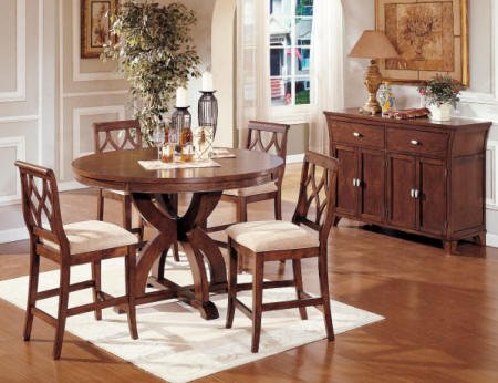 The Waldon dining set from Cramco features a round walnut finish star veneer birch table and Woven Taupe upholstered solid birch stools. This traditional style dining set is perfect for smaller dining areas. We will bring your Dining Set Inside! We won\'t leave it curbside like the other guys.