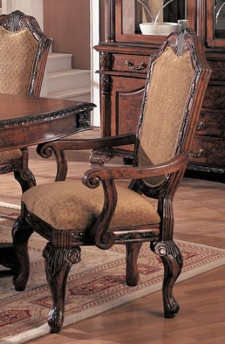 Set of 2 European Style Saint Charles Collection Dining Arm Chair /Chairs This is a set of 2 dining arm chairs from the Saint Charles collection. In the grand European tradition of elegance, Saint Charles collection is crafted from Ash Burl veneers and selected solid hardwoods. The seat cushions are made of gold patterned fabric, well built and durable. Stylish, elegant, and perfect for any classic home decor. Item requires simple assembly. Purchase includes 2 chairs. Specifications - Dimensions: 21"W, 21-1/4"D, 42"H - Style Type: European Style - Materials: Wood - Color: Brown - Pieces: 2 - Finish: Brown