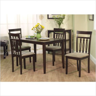 24015ESP Features: -Set includes one shaker dining table and four dining chairs. -Espresso finish. -Constructed of Solid rubber wood. -Polyurethane foam padded chair seat upholstered in neutral color fabric. -Contemporary chair features needle eye design on back and tapered legs. -Some assembly required. Specifications: -Dining table dimensions: 29'' H x 28'' W x 45'' D. -Dining chair dimensions: 37.5'' H x 16.75'' W x 16.54'' D.