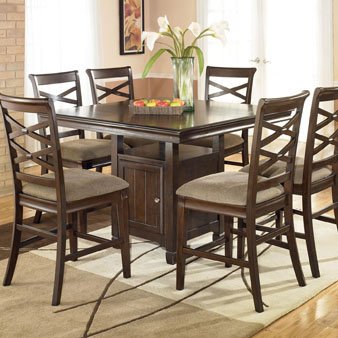 The rich finish and stylish contemporary design of the Highland Park dining room collection transforms your dining area with an atmosphere of exciting details that command a presence within any decor. The select veneers are bathed in a dark brown finish that flows smoothly over the concave drawers and profile details to beautifully capture the refreshing contemporary design. With the classic look of antique nickel color hardware perfectly complementing the rich finish, this collection is sure to enhance any dining environment.Set includes table and 4-24'' stoolsMade with select veneers and hardwood solidsDark brown finishAntique nickel color hardwareStorage with wine glass holders and bottle support bars2 doors and 1 shelfUpholstered cushioned seat